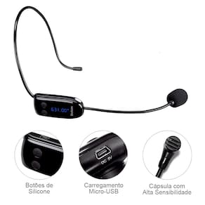 CARACTERÍSTICAS GERAIS Display: LCD Haste de Cabeça: Maleável Carregamento: Micro USB Alimentação Bivolt Automático: 110/220V Bateria de Lítio: Interna e recarregável de 550mAh Alcance da transmissão: de 25 a 35 metros sem barreiras Tempo de Operação: 3~4h Tempo Recarga: 2~3h Compatibilidade modelos: AX / A20 / T8 Cor disponível: Preto Possui certificação de homologação da ANATEL Garantia: 06 Meses do fabricante - ONSITE*
