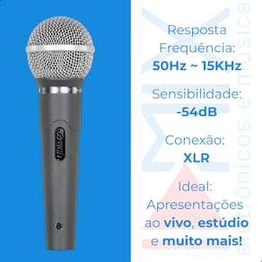 O Leson LS58 é um microfone dinâmico cardióide projetado para voz e fala, ideal para igrejas, palestras, eventos e karaokê. Possui cápsula com ímã de neodímio, que garante maior sensibilidade e clareza, além de construção metálica resistente e chave liga/desliga no corpo.