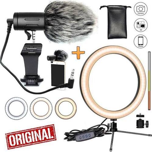 Microfone direcional condensador omnidirecional para celular gravação de vídeo + iluminador ring light led anel suporte Produto com eletrônica. Microfone profissional direcional para celular e câmeras dslr. dois em um + ring light Microfone direcional Conexão p3 para celular e p2 para câmeras que possuem conexão mic in -compatível com celular. -acompanha corta vento. -o microfone pode ser fixado no local do flash- 1/4 sapata padrão e possui plug com conexão p2 Microfone profissional para ser em câmeras dslr, câmeras com entrada para microfones mic in do tipo p2 e também em celulares com entrada p2. Sua espuma corta vento permite amenizar bastante o incomodo ruido do vento durante as gravações O microfone direcional, permite captar um som natural, nítido e de excelente qualidade Especificações: Resposta de freqência: 100-16000hz Sensibilidade:-40 db 0db = 1 v/pa a 1 khz Tipo: ms mid-side estéreo Tamanho: 9cm x 6cm x 2cm Peso: 39g super leve Iluminador ring light de 16 centímetros 6,5 polegadas , desenvolvido para maquiadores, fotógrafos, cinegrafistas, youtubers e etc, que buscam uma ótima maneira de iluminar com perfeição. O encaixe do ring ligth é através de encaixe padrão de tripés de rosca. O mini tripé também serve para utilizar em outros equipamentos de até 1kg de peso, como projetores, celulares e etc. É recomendado e extremamente eficaz para a macro fotografia, fotografia médica, odontológica, científica, hobby e para a iluminação/fotografia de produções de maquiadores. A alimentação do iluminador é através de cabo usb não acompanha adaptador de tomada e não possui bateria interna recarregável , você pode utilizar um adaptador de tomada de celular para ligar ou conectar no usb do computador ou outro equipamento que forneça 5v usb. O cabo usb deverá estar sempre ligado para funcionar. O pacote inclui: 01 - microfone conexão p3 ou p2 01 - espuma corta vento 01 - ring light 16cm com mini tripé 01 - cabo p2xp2 01 - cabo p2xp3 O kit vai pronto para uso. Homologação Anatel: 5200600160