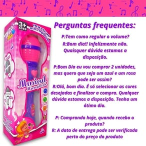 Todas nossas fotos e vídeos são reais, tiradas por nossa equipe buscando passar maior transparência para nossos clientes. = = = = = = = = = = = = = = = = = = = = = = = descrição = = = = = = = = = = = = = = = = = = = = = = = = = = = = Microfone infantil Você está pronto para se tornar uma estrela da música Apresentamos o microfone mágico de estrela cantora - o brinquedo perfeito para deixar sua criatividade brilhar como uma verdadeira diva do palco Recursos incríveis: Reproduza sua voz: solte a voz e cante suas músicas favoritas o microfone mágico de estrela cantora permite que você reproduza a sua voz de forma incrível. Deixe sua imaginação voar enquanto você canta como uma estrela de verdade. Músicas divertidas: o microfone vem com músicas alegres e empolgantes, que farão você Portátil e leve: leve a festa para onde quiser o microfone é portátil e fácil de segurar, permitindo que você seja uma estrela em qualquer lugar. Funções: toca musica e reproduz a voz O que você vai receber em sua casa conteúdo da embalagem Ideias de brincadeira: Karaokê em família: organize uma sessão de karaokê em casa, onde cada membro da família pode escolher suas músicas favoritas para cantar no microfone. Divirtam-se cantando juntos e fazendo performances. Banda de brinquedo: crie uma banda de brinquedo com outros instrumentos musicais de brinquedo, como tambores, guitarras e teclados. Vocês podem fazer uma apresentação musical completa com suas próprias músicas inventadas. Entrevistas engraçadas: incentive as crianças a fazerem entrevistas imaginárias com membros da família, amigos ou até mesmo com personagens fictícios. Elas podem usar o microfone para fazer perguntas engraçadas e improvisadas.
