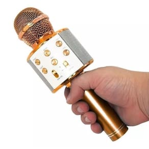 Microfone Karaoke Bluetooth Portatil Infantil Sem Fio Alto Falante Show Festa Escola Youtuber Dourado Microfone Karaokê Bluetooth Portátil com Mixer e Controle de Efeitos Recarregável Transforme qualquer lugar em um palco com esse microfone karaokê portátil! Conecte via Bluetooth ao seu celular ou tablet, ajuste o volume e o eco com o mixer embutido e cante suas músicas favoritas com estilo e liberdade.