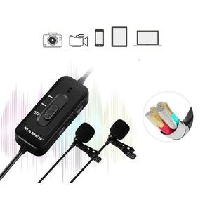 O Microfone de Lapela Duplo Profissional Mamen KM-D2 Pro Bateria Interna para Smartphones, Câmeras e Notebooks é um microfone de lapela omnidirecional duplo, com Interruptor externo com Modo SmartPhone e Modo Câmera Digital, para dispositivo de gravação compatível com diferentes dispositivos de gravação universal com Plug P2 3.5mm e acompanha Adaptador Plug de 6.3mm. um Microfone de Lapela omnidirecional, perfeito para uso em vídeo, projetado para smartphones, DSLR, filmadoras, gravadores de áudio, PC, entre outros. Seu Cabo de 8metros de comprimento, sendo 2 metros do Conector da Câmera ate o Interruptor + 6 metros do Interruptor ao microfones Lapelas.O Microfone Profissional Duplo Lapela Mamen KM-D2 Pro Bateria Interna pode ser amplamente utilizado para gravação de entrevistas, gravação de vídeo, ensino em sala de aula, transmissão Live Streaming, discurso em conferência, apresentação em vídeo etc. Microfone profissional de captura omnidirecional com ampla resposta de frequência e resolução de som de alta definição.O Microfone de Lapela Duplo Profissional possui interruptor de corte de ruído externo ajuda a reduzir o ruído de baixa frequência e o som do vento. Interruptor de alavanca externo para dispositivo de gravação, compatível com diferentes dispositivos de gravação. Bateria recarregável interna de polímero de íon de lítio. Indicador de baixa energia, conheça a condição de serviço da bateria. Design leve, flexível e fácil de configurar e operar.Recolhimento total de 360 graus Cabeça do Lapela comperfuração do capacitor de alta sensibilidade, modo de captação de som omni-direcional de 360 . Nova tecnologia de decodificação de som, timbre de som é mais transparente.Ideal para Smartphones, Câmeras DSLR, Câmeras Digitais dv, Filmadoras, Computador desktop, Notebooks, Laptops, Tablets, Gravadores de Áudio, Misturador de Som Digital, Amplificador, e muito mais.
