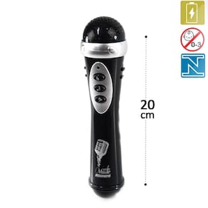 Microfone Musical Infantil POP Star Preto Microfone Infantil Musical, Diversas Musicas E Acende Luzes Brilhantes, Utiliza 2 Pilhas "Aa" (Não Inclusas);\nEspecificações:\nMarca : ARK\nTipo de material : Plástico E Componentes Eletricos\nCores ou Estampa : Cores\nDimensões do Produto : 20 X 4,5 X 4,5 CM\nDimensões da Embalagem : 25,5 X 0 X 15,5 CM\nPeso Bruto (Gramas) : 0.082