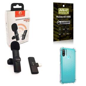 Microfone Sem Fio Profissional com presilha Tipo C H'maston O Microfone Sem Fio Profissional com presilha Tipo C H'maston de alta sensibilidade com captação de áudio 360 graus, possui resposta rápida para que você grave todos os detalhes de som Qualidade de som pura, comparável a uma equipe de gravação profissionalEste Microfone Sem Fio H'Maston MK-04 Wireless 360 com Interface USB-C para SmartPhone e Tablets Android, além de PC com entradas USB-C Type-C , possui uma alta qualidade de som, é portátil e muito fácil de usar, sendo Plug and play apenas colocar em seu smartphone e usar. O Sistema Wireless de Microfone Lapela para Equipamentos USB-C possui Bateria Interna com duração de até 10 horas e trabalha com uma distância de até 20m. O Microfone Sem Fio Profissional com presilha Tipo C H'maston é emparelhado automaticamente imediatamente após a conexão, sem necessidade de aplicativos, sem fios irritantes, sem depuração, apenas conexão instantânea Principais Características: Plug and play, conexão de um clique, fácil de usar. Áudio limpo e preciso e mão livres ao gravar Conector USB-C para SmartPhone e Tablets Android Captação de áudio sem ponto cego de 360 grau Latência muito baixa de 9 milissegundos Alcance de até 20 metros em locais sem obstáculos Função antirruído do circuito de redução de ruído Bateria Interna com duração de até 10 horas Qualidade de som pura e alta sensibilidade Compatível com uma variedade de dispositivos Adequado para todos os tipos de transmissão ao vivo, gravação, entrevista, gravação de vídeo, Vlogs, Youtubers, aulas online e muito mais.-------------Película de Vidro 3D Blindada - ArmyshieldA película de vidro 3D para celular é um produto de alta qualidade que oferece proteção e estilo para o seu dispositivo móvel. Feita de vidro temperado de alta resistência, a película é projetada para se encaixar perfeitamente na tela do seu celular, proporcionando uma cobertura completa e proteção contra arranhões, rachaduras e outros danos.A película de vidro 3D é especialmente projetada para se curvar suavemente ao redor das bordas do seu celular, criando uma aparência elegante e sem bordas. Isso significa que você pode desfrutar de uma experiência de visualização imersiva e sem interrupções, sem se preocupar com a película descolando ou interferindo na sensibilidade da tela.Atenção: O produto acompanha apenas o que apresenta na imagem.