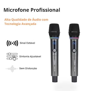 Eleve o nível das suas apresentações, palestras ou sessões de karaokê com o Kit Microfone Sem Fio Duplo Coibeu Profissional é projetado para entregar áudio de alta qualidade e liberdade de movimento, este sistema de microfone duplo com transmissão UHF garante uma conexão estável e livre de interferências. Com tecnologia cardioide que foca na sua voz e reduz ruídos de fundo, você terá uma performance clara e profissional. A luz RGB e a compatibilidade com P10 e P2 o tornam a escolha perfeita para qualquer evento ou sistema de áudio.