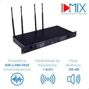 Sistema UHF True Diversity: opera entre 630 e 680?MHz, com duas antenas independentes para evitar cortes de sinal.