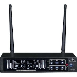 Microfone Sem Fio Harmonics Hsf-300 Duplo O Microfone Sem Fio UHF multi-frequência com Display Digital e função Auto Scan Harmonics HSF300 Duplo é um sistema sem fio de mão duplo projetado para fornecer qualidade de som excepcional em apresentações ao , karaokê, eventos corporativos e outras situações de desempenho. Este microfone sem fio possui duas unidades de mão com transmissores de frequência UHF independentes, o que significa que cada microfone pode ser individualmente ou simultaneamente para oferecer um desempenho em dueto. Acompanhado de dois microfones sem fio com capsula padrão cardioide e um receptor sem fio compacto que possui uma tela LED que exibe informações importantes, como o status da bateria e a frequência selecionada. O receptor também possui duas saídas XLR balanceadas para conectar diretamente a uma mesa de mixagem ou amplificador de som. O design robusto do microfone HSF300 Duplo o torna durável o suficiente para suportar o uso repetido, e seu acabamento oferece uma aparência em qualquer situação de desempenho.