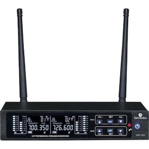 Microfone Sem Fio Harmonics Hsf300-2 Modelo: HSF300-2 O Microfone Sem Fio UHF multi-frequência com Display Digital e função Auto Scan Harmonics Duplo HSF300-2 é um sistema sem fio de mão duplo projetado para fornecer qualidade de som excepcional em apresentações ao , karaokê, eventos corporativos e outras situações de desempenho. Este microfone sem fio possui duas unidades de mão com transmissores de frequência UHF independentes, o que significa que cada microfone pode ser individualmente ou simultaneamente para oferecer um desempenho em dueto.