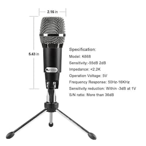 Grave áudio de qualidade de estúdio diretamente no seu computador via USB com o microfone condensador Fifine K668 - uma ótima opção para vocais e instrumentos, bem como para criar podcasts e narrações para vídeos. Compatível com os sistemas operacionais Windows e Mac OS, você pode simplesmente conectar o K668 ao seu PC e começar a gravar. Presente ideal para streamer twitch, jogadores de computador e youtubers. Característica principal: 1. Plug and Play: compatível com Windows e Mac e sem software para instalar. 2. Padrão de captação Omni distintivo: cancelamento de ruído e isola a fonte de som principal. 3. Resposta de frequência suave e plana de 50 Hz a 6 KHz. 4. Design elegante: estrutura de metal de liga de alumínio durável preta e aparência de tela prateada Grave diretamente no seu computador. O microfone K668 é ideal para tudo, desde vocais de estúdio a fala, instrumentos, podcasts e gravação de mesa. O microfone condensador é projetado para vocais e instrumentos, com um padrão de captação cardioide que isola a fonte de som principal e minimiza o ruído de fundo, destacando o desempenho. A resposta de frequência estendida e suave K668 é excelente para canto, fala e instrumentos. Plug and Play USB O microfone de gravação USB K668 torna a gravação de vocais ou instrumentos no seu computador uma operação plug and play. O K668 é compatível com Windows e Macintosh, sem software para instalar -- basta conectá-lo a qualquer porta USB disponível, selecioná-lo como sua entrada nas configurações de software e você está pronto para criar seu próprio áudio. Ótimo para podcasts. A resposta de frequência ampla e o padrão de captação focado são ideais para gravação em desktop, particularmente podcasts. Use o microfone K668 e o suporte de microfone de mesa incluído para podcast pela Internet, crie seu próprio áudio para vídeo ou grave suas próprias músicas. Basta ligar e começar a gravar. Pacote: 1 microfone USB com cabo de áudio de 1,8 m, 1 tampa de espuma antivento, 1 suporte de tripé de metal, 1 manual do usuário (sem garantia de versão em português)