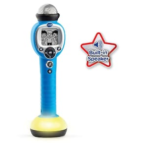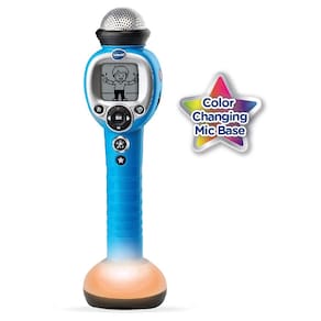 VTech Kidi Star Music Magic Microfone, azul - Remova ou reduza a faixa vocal principal de suas músicas favoritas para que você seja o vocalista principal no Music Magic Mode - Conecta-se a leitores de MP3 ou dispositivos móveis com o cabo de áudio incluído para que você possa cantar músicas da sua própria coleção - Efeitos de luz colorida ajudam a criar uma atmosfera emocionante para o seu desempenho - Use o gravador embutido para gravar você mesmo por até 2 minutos - Requer 2 pilhas AA (pilhas incluídas apenas para fins de demonstração; baterias novas recomendadas para uso regular); Este microfone de brinquedo é destinado a idades de 5 a 9 anos
