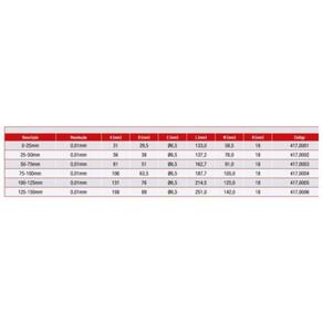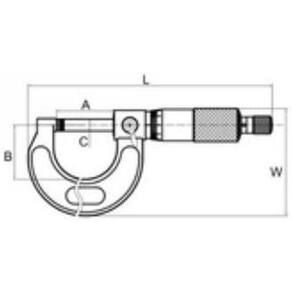 O Micrômetro é um instrumento de leitura direta das dimensões reais do objeto, com precisão da ordem de milésimos. - Capacidade de Medição: 50 a 75mm - Resolução mm : 0,01; - A Comprimento do encosto móvel mm : 81 - B Distância do batente ao arco mm : 51 - C Diâmetro do encosto móvel mm : 6,5 - L Comprimento total mm : 162,7 - W Altura total mm : 91 - H Diâmetro do tambor graduado mm 18.