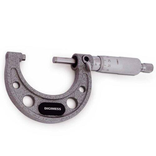 Arco fabricado em ferro fundido nodular, pintado e esmaltado Tambor, bainha e catraca em metal cromado fosco Fuso em aço temperado com Ø6,5mm Alavanca de fixação do fuso Faces de medição em metal duro micro lapidadas Pressão de medição através de catraca na extremidade do tambor Graduação de 0,01mm Haste padrão para zeragem nas capacidades acima de 25mm Chave para zeragem da bainhaCapacidade: 25-50mm / Exatidão: 0,004mm110.101