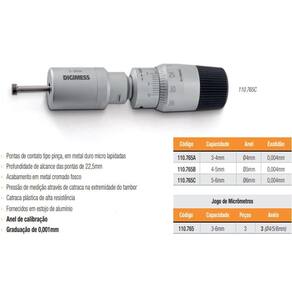 - Pontas de contato tipo pinça, em metal duro micro lapidadas;- Profundidade de alcance das pontas de 22,5mm;- Acabamento em metal cromado fosco;- Pressão de medição através de catraca na extremidade do tambor;- Catraca plástica de alta resistência;- Fornecidos em estojo de alumínio;- Graduação de 0,001mm.
