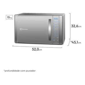 Especificações Técnicas Modelo: ME41X Cor: Prata Capacidade Total: 31 litros Capacidade Útil: 18 litros Potência: 1550 W Nível de Potência: 10 Consumo de Energia: 0,02 kwh/mês Selo Procel Eficiência Energética : B Acabamento: Porta espelhada + e acabamento na cor prata Porta Espelhada Prato Giratório Luz Internar Relógio Voltagem: 110V ou 220V não é bivolt EAN: 7896584076424 110V / 7896584076431 220V Garantia: 12 meses