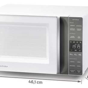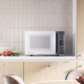 Micro-ondas de bancada com 23 litros de capacidade e 1100W de potência. Possui puxador embutido e design na cor branca. Fabricado em aço, plástico e vidro.Função Grill