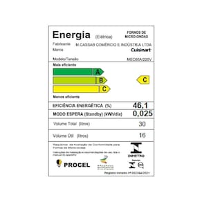 Primeiro produto no mercado com forno combinado e microondas nessa categoria. Valoriza, inspira e integra os ambientes! Tem a função timer que possibilita programar o início e o término dos seus pratos automaticamente e vem com 6 programas de culinária. O Microondas, Grill e Forno Elétrico Cuisinart apresenta 6 funções: Convecção; Programa combinado; Grill, Auto-menu; Descongelar e Microondas.A nova linha de Microondas combinado da americana Cuisinart proporcionará em sua cozinha um design moderno e sofisticado aliado à qualidade que só a Cuisinart oferece com sua gama de produtos.Especificações do produto:- É indispensável a instalação com fio terra- Projetados para serem embutidos- As paredes e superfícies próximas devem ser de material resistente a temperatura de 90C (tais como madeira, fórmica, inox, granito, mármore)- Painel: Digital- Grill elétrico: Sim- Timer: Sim- Porta de Vidro: Sim- Porta de Vidro Removível: Não- Grelha: Sim- Prato de vidro (30cm): Sim- Trava de Segurança: Sim- Luz interna: Sim- Tratamento anti-digital: Sim- Bitola do fio (mm): 2,5Ficha técnica:- Código: 4092840018- Marca: Cuisinart- Modelo: Casual - Conteúdo da Embalagem: 1 Forno Elétrico- Especificações do produto: Prato giratório 30 cm- Material: Aço inox 304- Capacidade: 31 Litros- Voltagem: 220V- Potência: 1450W- Frequência: 60Hz- Potência nominal: 1450 W- Potência do grill: 1200 W- Potência da convecção: 1350 W- Consumo de energia: 0,134 kW/h- Peso do produto: 19,5kg- Dimensões do produto: 39cm x 60cm x 47cm (AxLxP)- Dimensões internas: 21,5cm 34cm x 36cm (AxLxP)- Peso com embalagem: 21kg- Dimensões com embalagem: 46,5cm x 66cm x 57,5cm (AxLxP)- Garantia: 1 Ano- Certificação BRA19/01745 - Produto possui certificação de segurança compulsória, certificado pelo SGS, organismo aado pela CGCRE do Inmetro