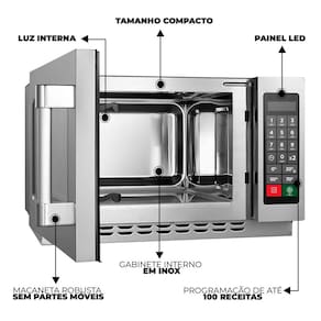 Otimize sua operação com o Micro-ondas Profissional 34L 1000W da Saro, desenvolvido para atender as exigências de cozinhas comerciais que precisam de agilidade, potência e durabilidade. Ideal para restaurantes, lanchonetes, padarias, fast foods, hotéis e outros estabelecimentos, este equipamento garante aquecimento rápido de alimentos congelados ou refrigerados, mantendo a qualidade, textura e apresentação dos pratos.