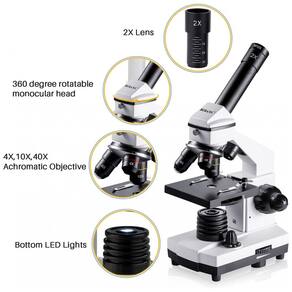 Ocular de alta ampliação WF25X sozinha ou com lente 2X, cooperar 4x 10x 40x lentes objetivas, microscópios biológicos oferecem 6 configurações de ampliação, 100X, 250X, 1000X, 200X, 500X, 2000X. Microscópios monoculares de foco grosso e fino com estrutura de metal sólido e botões de foco fino grosso garantem detalhes e ajuste preciso do foco, criando uma imagem mais clara e nítida. Sistema de Iluminação Dupla LED superior e inferior simultaneamente em campo claro, um condensador de lente única de 0,65 NA com diafragma de disco, fornece imagens com correção de cores de alta resolução. Acessórios completos Ele vem com adaptador de telefone, obturador de fio, 10 acessórios operacionais, conjunto de lâminas de microscópio de 15 peças, bolsa de transporte. Atenda a todas as suas necessidades de observação biológica. Ferramenta educacional prática Este microscópio biológico 100X 2000X foi projetado para ajudar estudantes, crianças, adultos, iniciantes, cientistas amadores, amadores, explorando o fantástico mundo da vida. É ideal para escola, laboratório ou ensino em casa, uma a uma instrução.