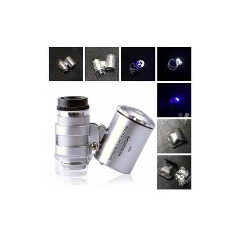 Descrição:Microscópio de bolso com luz LED e ultravioleta com ampliação de 60 x. Com sua luz ultravioleta, permite observar a vedação de água nas notas para saber se elas são falsas. Este mini microscópio tem uma ampliação de 60X. Você ficará surpreso ao ver até mesmo os menores detalhes ao observar notas, moedas, joias, selos, metais preciosos, insetos muito pequenos, dispositivos SMD e microcircuitos em eletrônicos, fibras têxteis, etc. Possui ótima iluminação para apreciar ainda melhor os detalhes, pois vem com baterias leves e de longa duração incluídas. Em caso de emergência pode servir perfeitamente como uma lanterna. Além disso, a lente é feita de vidro (não de plástico) e seu design compacto e ajustável a torna muito prática para levá-la a qualquer lugar. Especificações: Novo produto em sua caixa autêntico (ideal para presente): interruptor liga/desliga 60X Prata Cor\ n1x Estojos: 3,9 x 3,5 x 2 cm (largura x comprimento x profundidade)\ n3 baterias LR1130 incluídas.