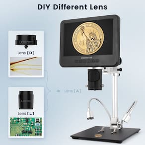 -?Ampliação de 18X-2040X?É adequada para várias ocasiões. Lente A (18X-720X) para observar moedas inteiras ou parciais, pedras, placa de circuito, etc., Lente D (1800X-2040X) para kits de lâminas biológicas, etc., Lente L (60X-240X) para observação de placa de circuito, solda PCB SMD, etc., Distância de observação: lente A (12mm-320X) mm), lente L (90mm-300mm), lente D (4mm-5mm).
