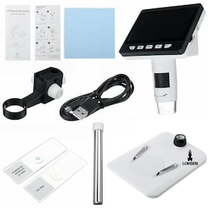 Itens inclusos: 1 microscópio digital 1 bateria de lítio-íon 3.7v/2600mah 2 lâminas para teste microscópico 1 flanela para limpeza Cabo usb com 92 cm de comprimento