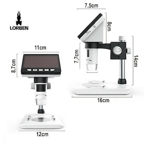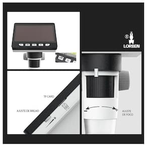 Marca: lorben Cor predominante: branco Sensor de imagem: 2m (sensor de imagem de alta qualidade) Ampliação: 0x ~ 1000x Display lcd: 9,5x5,5cm Alcance de foco: 0 ~ 40mm Modo de foco: manual Resolução: 1920x1080 2m, 1280x960 1m, 640x480 vga Formato de dados: jpg/avi Fonte de iluminação: 8 led com brilho ajustável Taxa de frames: 30 fps Sistema operacional compatíveis: windows xp, vista, win 7/8/10, mac 10.5 ou superior Interface: usb 2.0 Estrutura da lente: 2g+ir Abertura: f4.5 Ângulo da lente: 16° Idioma: português, além de inglês, alemão, francês, espanhol, italiano, japonês, chinês e coreano Fonte de energia: bateria de lítio-íon 3.7v/2600mah Fonte de alimentação: dc 5v da porta usb Autonomia e tempo de recarga da bateria: aproximadamente 5h Capacidade do cartão de memoria tf: 8gb a 32gb (não incluso)