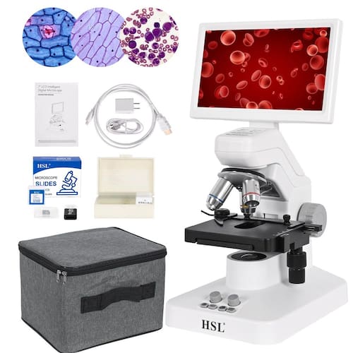 - O que é o microscópio HSL-110? Este é um poderoso microscópio biológico multifuncional para adultos, laboratório de ciências para estudantes, luz LED dupla, estágio mecânico de camada dupla, cartão TF de memória 8G que pode armazenar bem fotos e vídeos, equipado com uma bolsa para facilitar o transporte; pode ser utilizado continuamente por 5 horas ao ar livre;