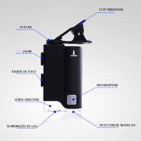 Agora você pode levar seu próprio microscópio no bolso. Com a opção de acoplamento para celulares com câmera, este microscópio portátil em zoom ajustável de 60x a 100x para visualização de todo tipo de objeto, podendo chegar a 800x ou mais com o uso conjunto do zoom do celular (dependendo da capacidade de zoom da câmera). Possui Led de cristal de longa vida (10 anos) com luz branca clara, que auxiliam na iluminação do objeto a ser observado. Conta também com luz UV para verificação de notas, ajudando a identificar possíveis fraudes. Ideal para colecionadores de todas as coisas pequenas: selos, moedas, livros antigos, insetos, plantas etc. e ótimo para cientistas amadores, estudantes, para avaliação de joias e o que mais desejar. Um ótimo produto para auxiliar no desenvolvimento de seus filhos, que estimulará a curiosidade das crianças em observar os detalhes de cada objeto.