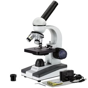Microscópio composto monocular LED portátil para estudantes da série AmScope M150 — ampliação de 40X a 1000X — O kit de microscópio inclui capa protetora contra poeira, 2 clipes e 2 oculares