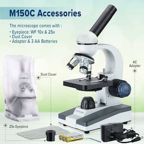- Ampliação: o microscópio da série M150 oferece ampliação de 40X, 100X, 250X, 400X e 1000X para exploração educacional e amadora