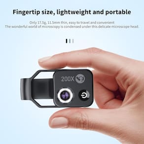 - formato de clipe: o microscópio é utilizado em forma de clipe com um taxa de ampliação de cerca de 200x, que pode caber em todos os telefones celulares do mercado.