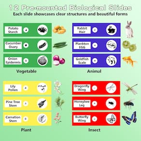 - 12 slides extras e presente perfeito: Inclui 12 slides de plástico cuidadosamente selecionados cobrindo quatro categorias: plantas, vegetais, insetos e animais. Cada slide apresenta estruturas claras e belas formas, combinando educação com diversão. Este conjunto de brinquedos para idades de 5 a 7 anos é divertido e educativo, o que o torna um presente ideal para meninos e meninas de 3 a 12 anos em aniversários, feriados, Natal ou como recompensa de aprendizagem.
