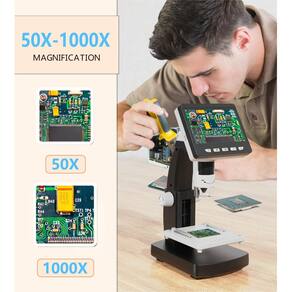 - Foco fixo de 50-1000x: com uma magnetização máxima de 1000x. Distância de focagem: 0-90 mm. 2 milhões de pixels de alta definição, com tela de alta definição colorida IPS de 4,3 polegadas, cores realistas, ângulo visual de 178°.
