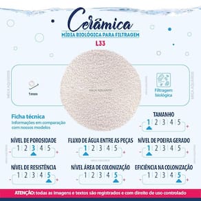 recomendada para filtros ultra finos. A cerâmica tipo matrix l33 mega aquários é uma mídia filtrante porosa e permeável de alto desempenho, fabricada a partir de materiais sintéticos e naturais como vidro e barro e sintetizados em alta temperatura que passam de 1200 graus, proporcionando um ótimo instrumento para a colonização de bactérias benéficas ao aquário ou lago. Essas bactérias realizam a nitrificação aeróbica e nitrificação anaeróbica ao mesmo tempo, tornando a qualidade da água mais saudável. Características:
