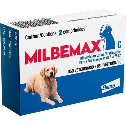 Milbemax Para Cães De 5 A 25kg Tratamento e controle de infecções intestinais por vermes redondos e vermes chatos e prevenção da dirofilariose. Modo de usar: Administrar dose única mensal a partir de 6 semanas de idade até completar 6 meses de vida. Gatas amamentando devem ser tratadas ao mesmo tempo que os filhotes. Adultos devem receber dose única mensal pelo menos 4 vezes ao ano para o tratamento e controle de vermes intestinais e continuamente para a prevenção de dirofilariose. VENCIMENTO: OUTUBRO/2022