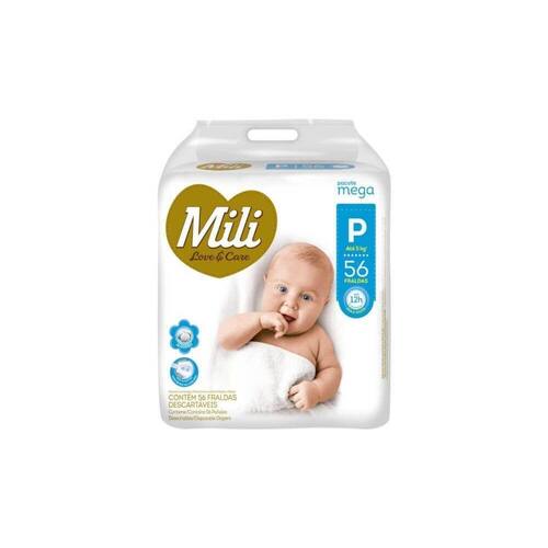 Mili Lovecare Fralda Infantil Mega P C/56 DESCRIÇÃO:Fralda Descartável Mili - Love & Care - Linha Premium. É especialmente projetada para ser usada durante a noite devido a sua superproteção. Imagem meramente ilustrativa. O produto pode ter variação de cor ou desenho, porém as características gerais são as mesmas especificadas na descrição do produto.AÇÃO/ATIVOS:Fralda de altíssima qualidade que vai atender as expectativas de quem procura o melhor para o seu bebe: qualidade, conforto e praticidade. Com Gel Super absorvente a pele do nenê fica mais seca por mais tempo, distribuindo o xixi de maneira uniforme, evitando que a fralda fique pendurada. Durante a noite a pele fica protegida devido a camada de gel ultra absorvente. Com até 12 horas de proteção, ela oferece todo o cuidado e suavidade que seu filho precisa para ficar sempre sequinho e confortável.MODO DE USAR:Coloque o bebê sobre a fralda aberta, com as fitas abre e fecha na parte traseira. Ajuste a fralda ao corpo do bebê. Posicione as fitas na faixa frontal, abra e feche quantas vezes for necessário. ESTE KIT CONTÉM: 01 UNIDADE DE MILI LOVECARE FRALDA INFANTIL MEGA P C/56Mili Lovecare Fralda Infantil Mega P C/56
