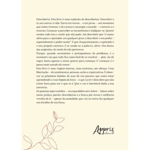 Descoberta. Este livro é uma explosão de descobertas. Descobrir a si, aos outros, à vida. Narra em versos – e em prosa – um momento que todos vivemos: o de crescer e enxergar o mundo – o interno e o externo. Começar a perceber as incoerências e indignar-se. Querer mudar tudo isso e sentir que não pode. Até descobrir que “o maior alívio para o oprimido, em qualquer grau, é descobrir o seu poder. / especialmente o poder sentir”. E que, frequentemente, o oprimido é o seu próprio carrasco. E aí, muda-se a palavra: alívio. Das dores, das angústias, do medo de não pertencer.