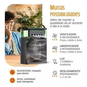 Tipo de luz: 7 luzes led Funções: ventilador / umidificador / aromatizador Tempo de pulverização: 2,5h - 12h modo umidificador Temporizador: pode desligar em 1h, 2h ou 3h