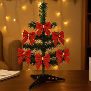 Acompanha 6 mini laços decorativos em vermelho e verde galão de 5cm, prontos para aplicação, garantindo um visual clássico e elegante sem esforço. A base em tripé plástico oferece estabilidade e fácil montagem.