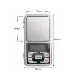 Especificação: Cor: Prata Dimensões: Cerca de 12x6.2x2 cm Tamanho da embalagem: 1306520mm Peso líquido: 109g Peso do pacote: 117g Gama: 0-100g Precisão: 0.01g 4 unidades de pesagem: g, oz, t1, ct Potência: 2 pilhas AAA Caixa Original: Sim