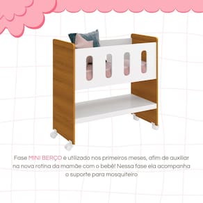 O Mini Berço Zain é um 3x1 perfeito para as mamães que precisam de um Berço portátil para deixar do lado da cama ou acompanha-la nas atividades do dia-a-dia, se transforma em trocador e escrivaninha. Numero de Registro 000185/2020 Acabamento: Pintura UV Acompanha Cama Auxiliar: Não Acompanha Dossel: Não Acompanha Móbile: Não Acompanha Suporte para Mosquiteiro: Sim - Sem Véu Altura: 94 cm Altura do Estrado até o Chão: 57 cm Altura dos Pés: 5 cm Ambiente Principal: Quarto de Bebê Certificação Inmetro (Código): 0001852020 Certificado: INMETRO - 000185/2020 Complexidade da Montagem: Média: pode ser montado por mais de uma pessoa e/ou necessite de maior conhecimento para montagem Cor: Branco/Savana Cor do Produto: Branco/Savana Escala de Brilho: Fosco Estilo: Clássico Estrado com Regulagem de Altura: Não Itens Inclusos: 1 Mini Berço, 1 Kit Ferragens e 1 Manual de Montagem Largura: 93 cm Linha ou Coleção: Linha Zain Manual de Montagem e Instalação: https://product-hub-prd.madeiramadeira.com.br/956154/documents/dc782815-81ff-4672-9b82-9e38014a63bc794195miniberozain.pdf Marca: Móveis Reller Material da Grade: MDF Material do Estrado: Sarrafo em madeira pinus e placas em mdf Material dos Pés: Plástico Material Principal: MDF Multifunção Flex: Se transforma em uma Escrivaninha ou Trocador Necessita Montagem: Sim Origem do Produto: Nacional Permite a Utilização de Cama Auxiliar: Não Peso: 21,6 kg Pintura Atóxica: Sim Portátil: Não Possui Gavetas: Não Possui Pés: 04 Possui Portas: Não Possui Prateleiras: Não Profundidade: 45 cm Recomendações de Uso, Manutenção e Limpeza: Limpar utilizando apenas pano semi umedecido com água, nunca utilizar abrasivos ou esponjas de aço Rodízio com Trava: Sim Sapatas Niveladoras: Não Sistema Anti-Refluxo: Não Sistema de Montagem: Parafusos, Cavilhas e Minifix Suporta Até (kg): 15 kg Tamanho do Colchão Indicado (L x C): 90x40 Tipo de Berço: Mini Berço Tipo de Estrado: Fixo Tipo de Grade: Fixa Marca: Não Informado