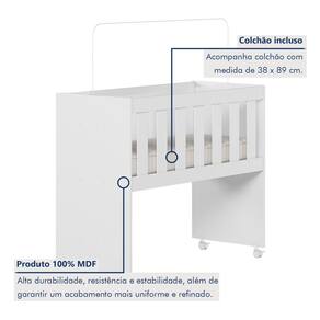 Material Principal: 100% MDF Acabamento: Pintura UV Atóxica (Acetinado) Transformação: Miniberço, Mesa de Recreação, Mesa de Estudos, Aparador e Escrivaninha Rodízios: Sim, com trava de segurança Acompanha Colchão: Sim (Densidade D-18) Suporte Mosquiteiro: Sim (Incluso) Garantia: 90 dias contra defeitos de fabricação