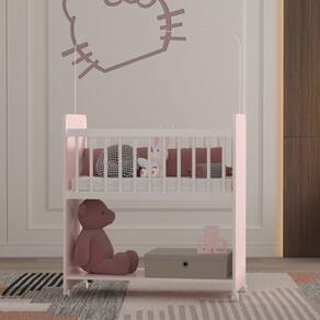 Mini Berço Fixo Compacto Portátil Para Bebê com Rodízio Colchão Suporte Para Mosquiteiro e Prateleira Rosa Branco