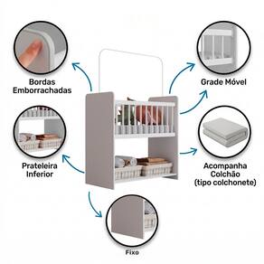 Produzido em MDP de alta qualidade com acabamento em pintura UV, este mini berço para bebê oferece resistência e fácil limpeza. Seu design inteligente conta com grade móvel revestida em PVC e bordas com perfil emborrachado, proporcionando mais segurança e proteção para o bebê.