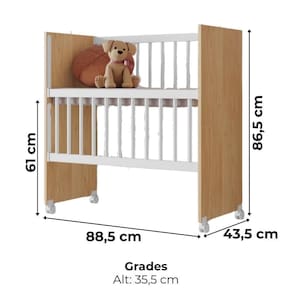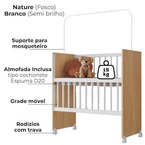 Mini Berço Encanto, desenvolvido para oferecer segurança e conforto ao bebê. Estrutura em MDP/MDF (6/12/15/25 mm) e acabamento UV. Composto por grade móvel e ajustavél (MDF revestivo em PVC virgem) e suporte superior para mosquiteiro. Possui rodízios com trava e acompanha almofada tipo colchonete (espuma D20). Não acompanha pelúcias ou itens de decoração. Produto será entregue em 01 volume.
