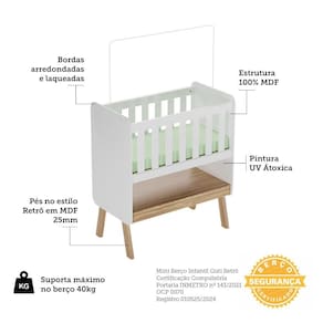 Mini Berço Guti Retrô com Colchão - Móveis Peroba O Mini Berço Guti Retrô é uma opção charmosa, segura e versátil para o quartinho do bebê. Produzido em MDF com pintura UV atóxica, é certificado pelo INMETRO e oferece três funcionalidades em um só produto: mini berço, mini aparador ou mini escrivaninha. Com bordas arredondadas e laqueadas, grades fixas e estrutura firme, proporciona segurança e conforto. Os pés em estilo retrô dão um toque especial ao design. Acompanha suporte para mosquiteiro e colchão nas medidas 84 x 7 x 41,3 cm.
