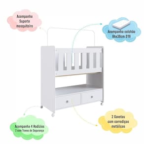 Marca: Completa Móveis | Modelo: Mini Berço | Material: MDP | Acabamento: Fosco | Cor: Branco | Largura (cm): 90 | Altura (cm): 95 | Profundidade (cm): 45 | Peso do Produto (Kg): 27,10 | Quantidade de Volume: 2 | Peso Suportado (Kg): 15 | do Certificado Registro do Inmetro: 002476/2018 | Tipo de Grade: Fixa | Material da Grade: MDF | Espaço entre Barras da Grade (cm.): 6 | Material do Estrado: Suportes dos lastros em madeira maciça e lastros em MDF | Quantidade de Regulagem do Estrado: 1 | Opções de Altura do Estrado (cm): 57 | Acompanha Suporte de Mosquiteiro: Sim, sem véu | Colchão Indicado (LxPxA) (cm): 86x38x10 | Acompanha Colchão: Sim | Possui Gaveta: Sim | Tipo da Corrediça: Metálica | Peso Suportado por Gaveta (Kg): 3 | Possui Puxador: Sim | Material do Puxador: Plástico | Necessita Montagem: Sim | Nível de Dificuldade da Montagem: Médio | Sistema de Montagem: Sistema de montagem via parafusos, cavilhas e sistema minifix | Idade Recomendada (meses): 0 à 6 | Idade Mínima Recomendada (meses): 0 | Idade Máxima Recomendada (meses): 6 | Quantidade de Item: 1 | Duração da Garantia: 6 Meses | País de Origem: | Tipo de Garantia: Garantia do Fabricante | Dimensão (AxLxC) cm: 95x45x90 | Possui Rodízios: Sim, 2 com trava e 2 sem trava | Inclui Manual de Montagem: Sim