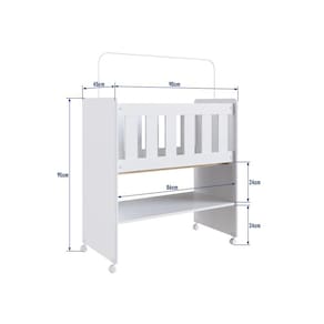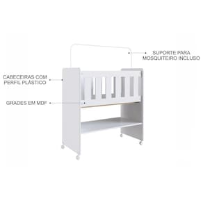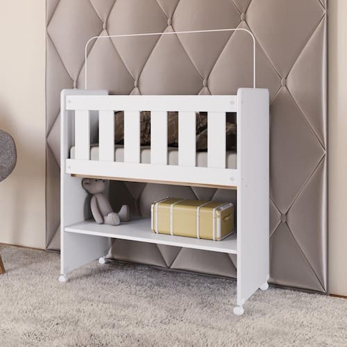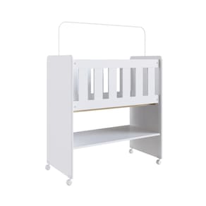 Mini Berço Moisés com 01 prateleira na cor branca, com rodízios e grade fixa, produto compacto, permite utilização ao lado da cama dos pais, facilitando o acesso ao recém nascido. Produzido em MDP com suporte de lastro em madeira maciça, lastros em MDF 9mm e grade em MDF.