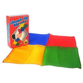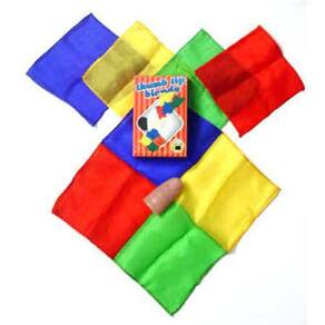 O mágico mostra 4 lenços de seda pequenos com 4 cores diferentes vermelho, azul, amarelo e verde Os lenços são colocados no punho da mão esquerda mas quando abre a mão novamente aparece um lenço maior com os 4 lenços pequenos costurados.