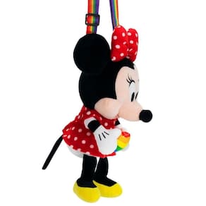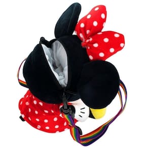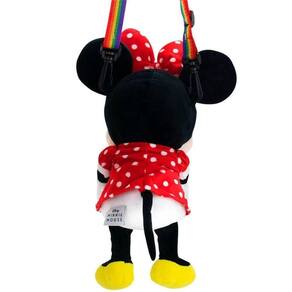 Pequena bolsa fechamento a zíper no formato de pelúcia da Minnie de 20 cm de altura (medida sentado). As pernas são soltas, podendo ficar estendidas. Quando colocado na superfície fica sentado. Minnie está segurando um coração na cor arco-íris, combinando com a alça removível da mesma cor. Coleção orgulho LGBT+. Material: poliéster; Enchimento: fibra de poliéster; Produto certificado por Órgão acreditado pela CGCRE do INMETRO